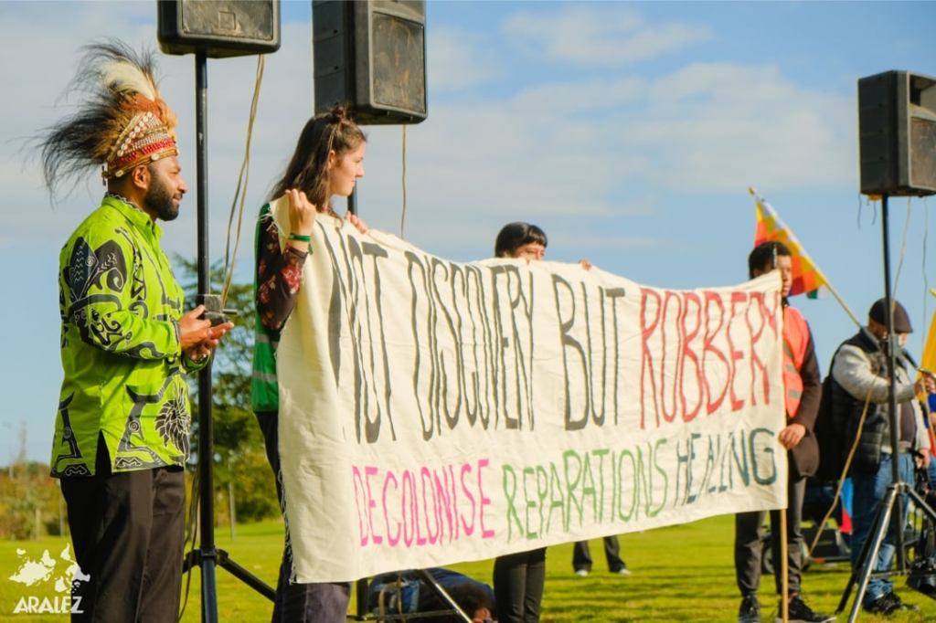 We start at the head of Java with a Mapu ceremony for commemoration and solidarity. The start of the ceremony is at 17:30 where we start with two minutes of silence, so be on time. After ceremony, settlers and companies are put on trial by the 1492 People’s Tribunal.
